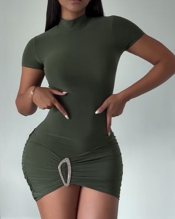 Women's Mock Neck Short Sleeve Ruched Mini Dress with Rhinestone Detail