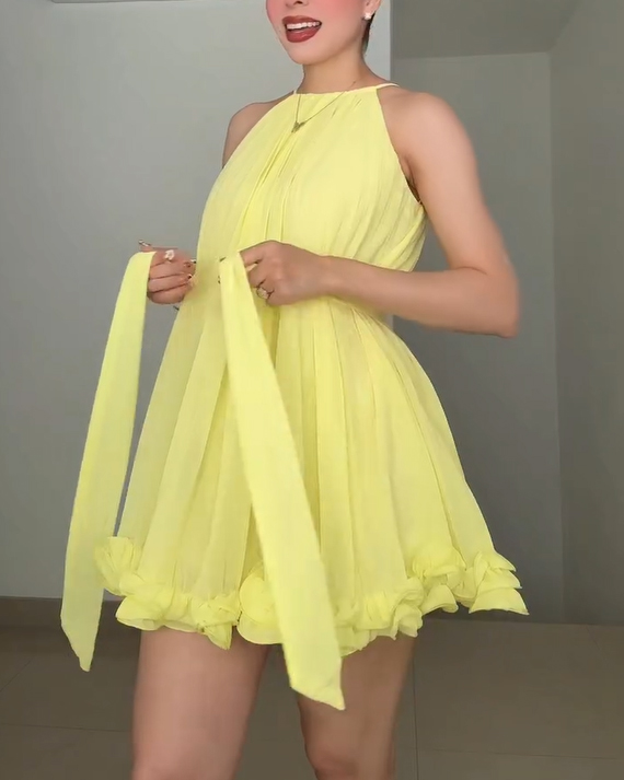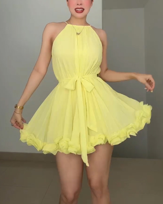 Women's Pleated Halter Neck Chiffon Mini Dress with Ruffle Hem and Tie Waist