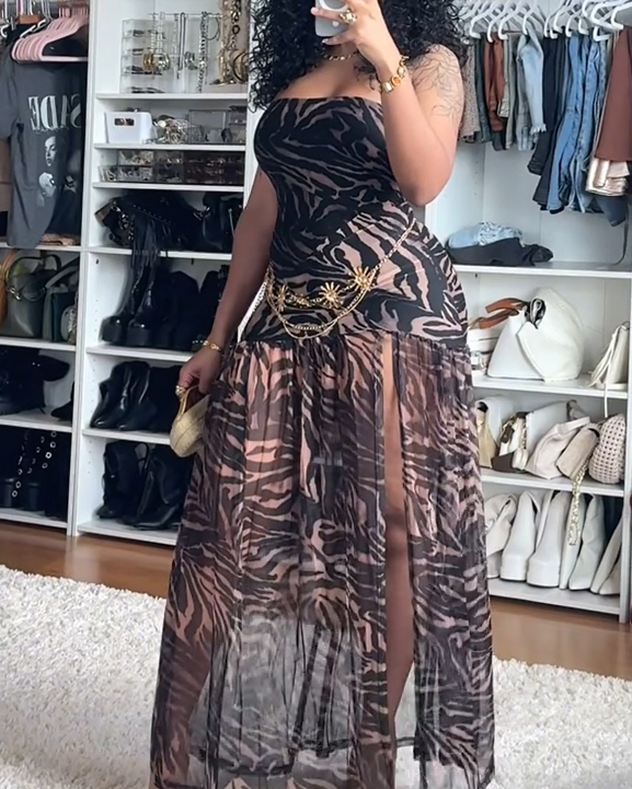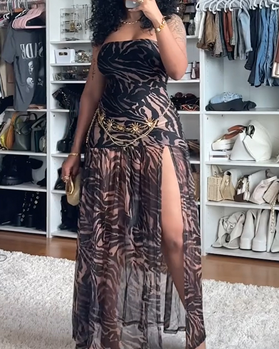 Strapless Leopard Print High-Slit Mesh Maxi Dress