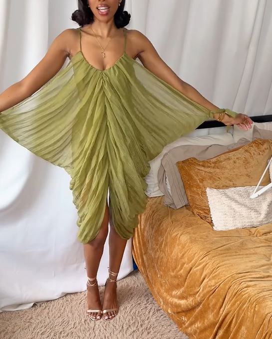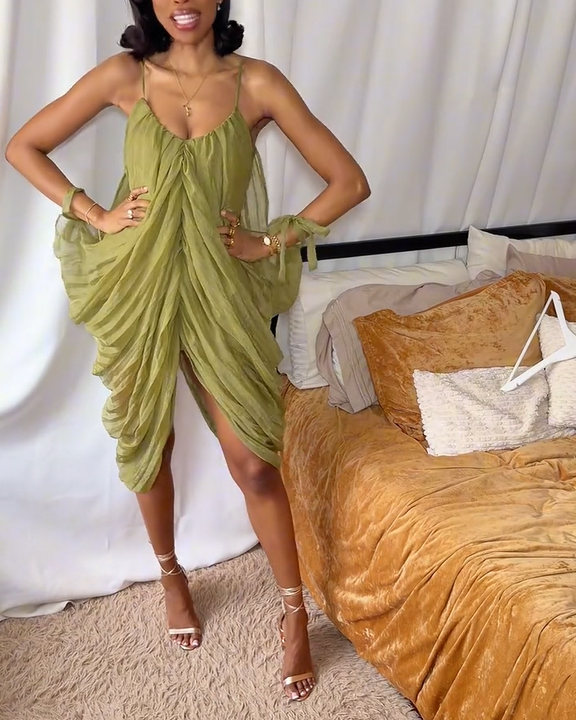 Women's Elegant Draped Mesh Midi Dress Sexy Plunging Neckline Ruched Cami Slip Dress