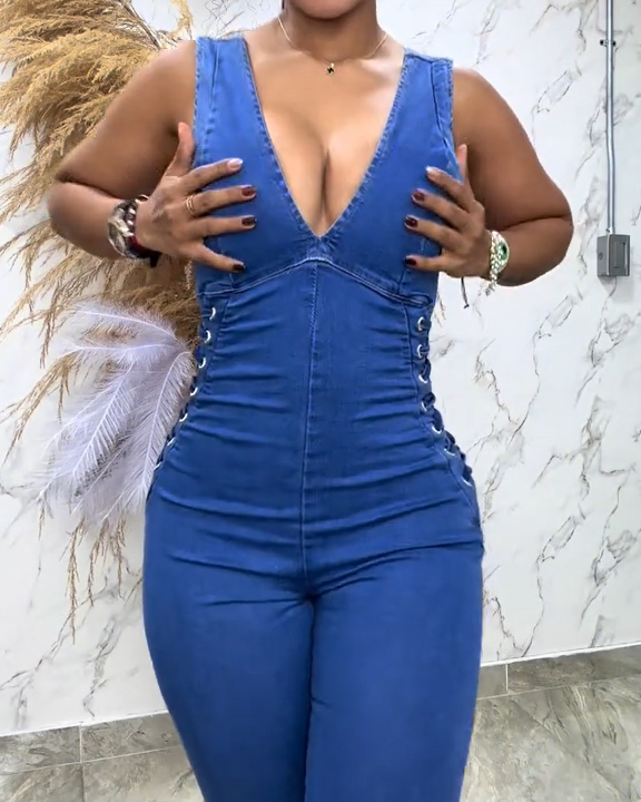 Women's Sexy Deep V-Neck Sleeveless Denim Jumpsuit with Side Lace-Up Details